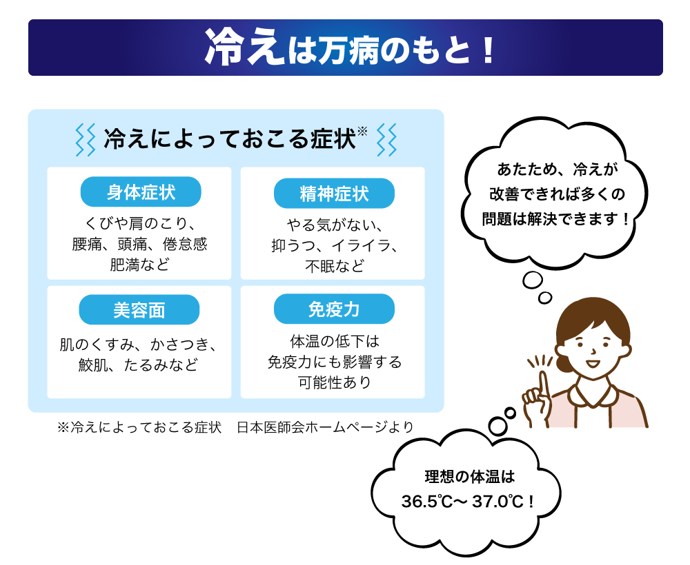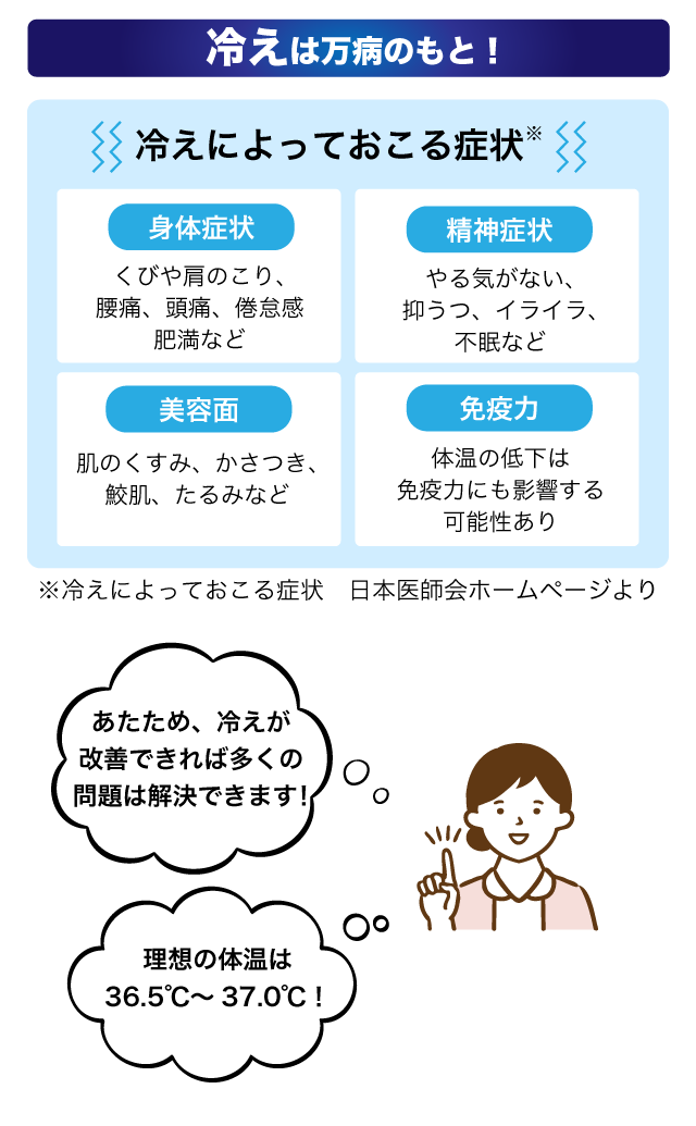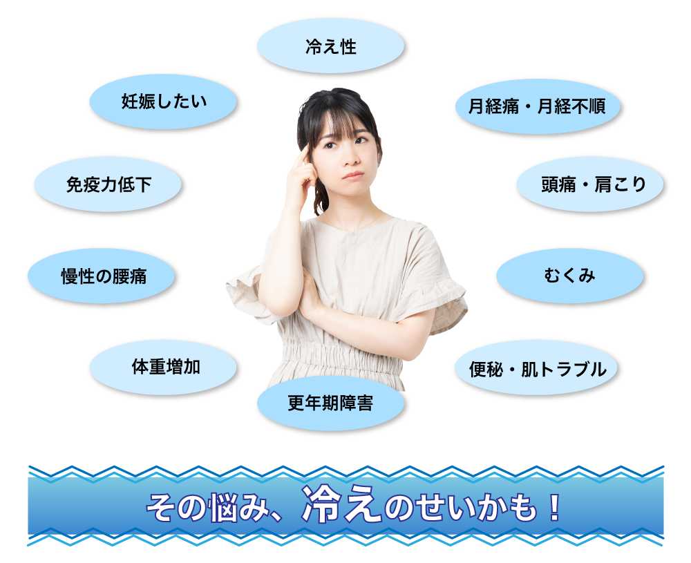 多くの女性がもつお悩みは、冷えからくるものが多く、冷えから起こる様々な症状は心身に影響を及ぼします。